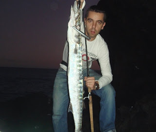 Tinha de safar a grade,e aproveitei o e sai a primeira bicuda,já mais contente,mais lançamentos mais uma ferragem,desta vez mais forte,e sinto que o peixe tem o leader na boca,só sinto a linha a passar de dente em dente,apesar de não ser a primeira vez que me acontece consegui resolver ao cair da noite e fui até ao final do pesqueiro,uma ponta de rocha de boa profundidade e com uma corrente forte o ideal para o que procurava.Mais uns lançamentos e um ataque umas corridas situação,e tive um peixe que deu uma boa luta apesar de ter entrado na amostra de maneira estranha(atacou a cabeça),coisa que só me acontece quando pesco nos portos com a amostra a passar paralela aos barcos